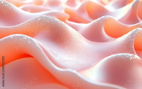 A close-up view of soft, wavy textures in shades of pink, resembling silk or fabric. The surface features delicate droplets, creating a serene and dreamy atmosphere.