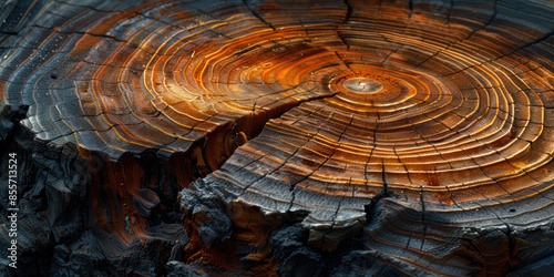 A close-up view of the cross-section of a burned tree stump, revealing the intricate patterns of its growth rings