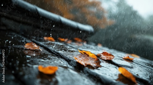 A close-up view of vibrant autumn leaves resting on a wooden surface, glistening with raindrops, capturing the essence of a serene, rainy day in nature's embrace.