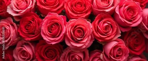 A close-up view of vibrant red roses in full bloom, creating a romantic and beautiful floral arrangement. The deep red color and soft petals emphasize love, passion, and beauty.