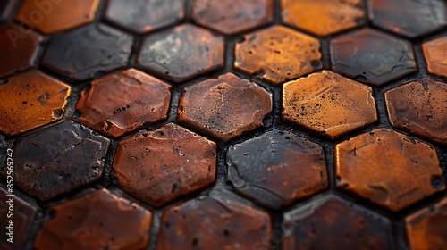 A close-up view of vintage styled octagonal tiles, highlighting their rustic colors and textures. The tiles feature intricate patterns and a weathered look with rich earthy tones.