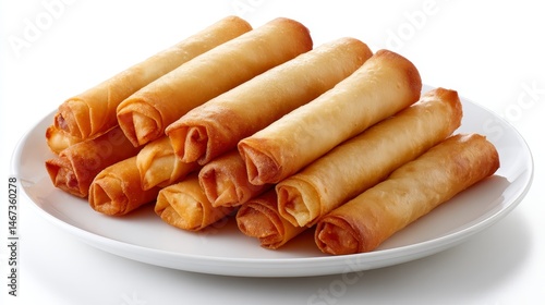 A close-up view showcases crispy golden-brown spring rolls artfully placed on a glossy white plate, offering a clean backdrop with bright white highlights