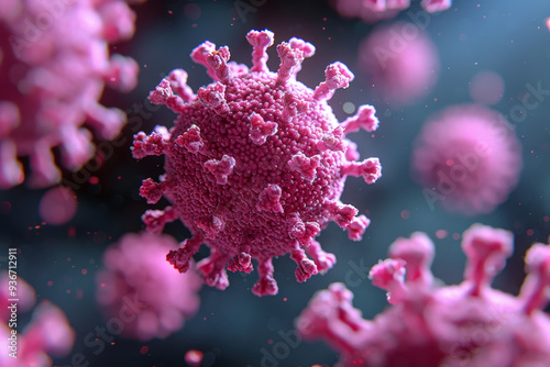 A close-up visualization of a COVID-19 virus particle, showcasing its distinct spike proteins and surface texture in vibrant colors against a dark background.