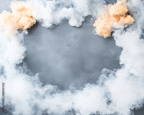 A cloud of smoke is hovering over a grey background. The smoke is orange and white, and it looks like it's coming from a fire. Scene is eerie and mysterious