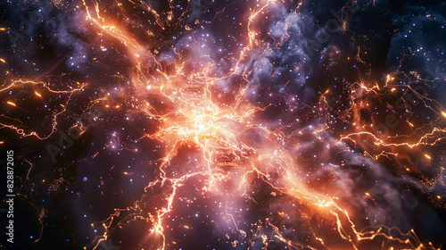 A cluster of bright lightning flashes emanating from a central point. Abstract, blurred background. Generative AI