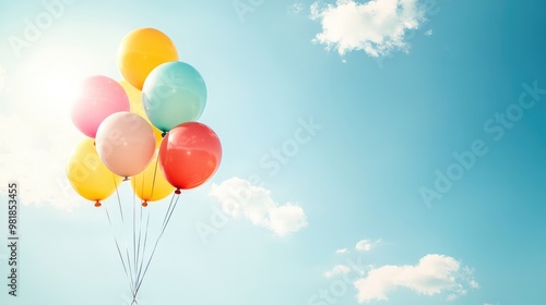 A cluster of colorful balloons floating freely against a clear sky, with bright clouds and a sunny, realistic background creating a festive mood