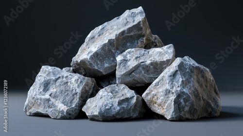 A cluster of gray stones is displayed on a smooth surface, showcasing varying sizes and textures. The dark background enhances the natural beauty of the rocks, creating a striking contrast