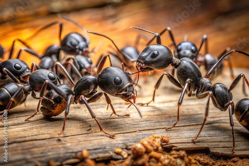 A cluster of industrious carpenter ants scurries silently across the weathered wooden surface, their antennae twitching as they search for sweet, sticky sustenance.