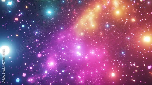 A cluster of multicolored glowing lights in a cosmic starry sky with a neon background rendered in 3D cartoon style
