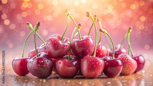A cluster of ripe cherries, glistening with dew, rests on a smooth surface, their vibrant red hues contrasting against a soft, bokeh-filled backdrop.