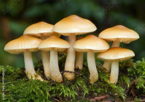 A cluster of small, golden mushrooms growing on a mossy surface in a natural setting.