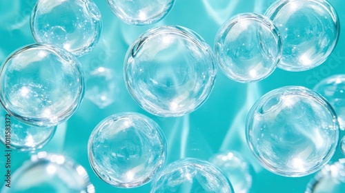 A cluster of transparent bubbles gently floats against a calming turquoise backdrop, reflecting light and creating a serene atmosphere suitable for relaxation and tranquility