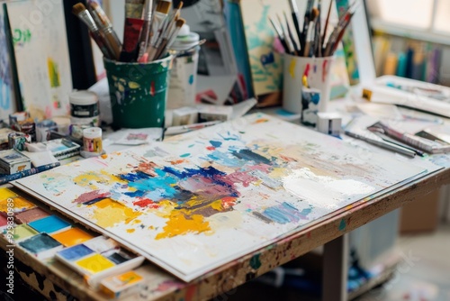A cluttered desk with a mood board in progress, featuring magazine clippings, paint swatches, and design elements