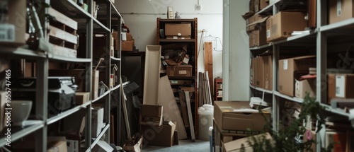 A cluttered storeroom filled with boxes, shelves, and everyday items, exuding a sense of chaos and hidden stories waiting to be discovered amidst the disarray.