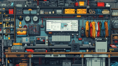 A cluttered workspace with a computer, tools, and supplies on shelves.