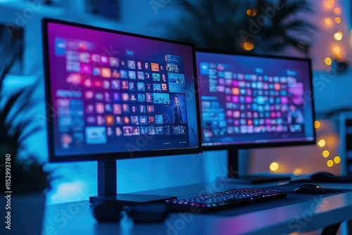 A clutterfree minimalist desk with dual monitors displaying a virtual conference, warm ambient lighting, hyperrealism