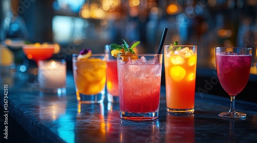 A cocktail bar table with a mix of colorful drinks and ambient lighting