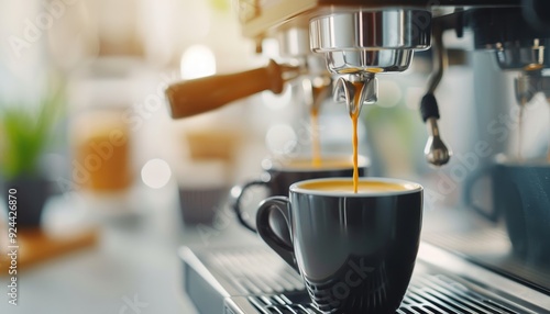 A coffee machine is pouring coffee into a black cup by AI generated image