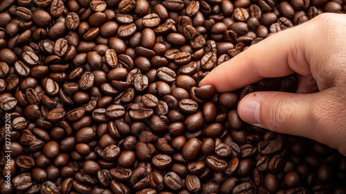 A coffee roaster's hand carefully inspecting freshly roasted coffee beans