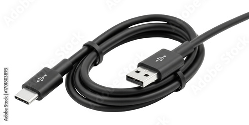 A coiled black USB cable with two different connector types is on a clean white surface. The cable is a piece of digital equipment. Isolated transparent background ( cut-out PNG file ).