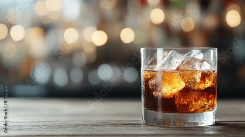 A cold, refreshing drink with ice cubes served in a glass. The scene is set against a blurred bar background, capturing the essence of a night out or social gathering.