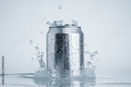 A cold silver drink can sitting in splashing ice water
