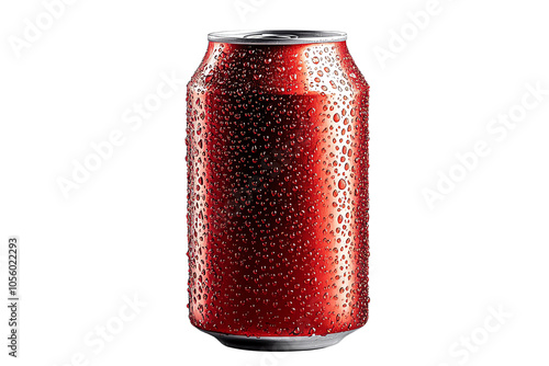 A cold soda can with droplets of water on its surface, isolated on a white background.