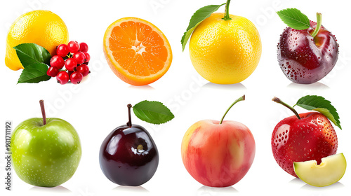 A collage of fresh fruit with a white background. There are apples, plums, oranges, a lemon, and some berries.
