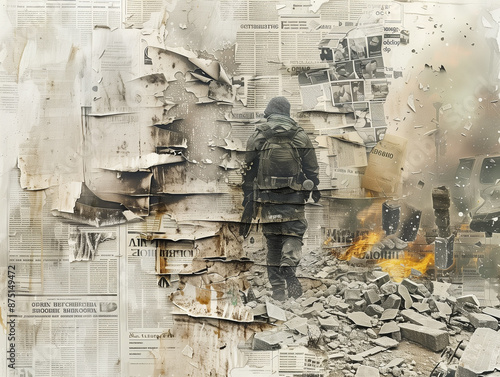 A collage of newspaper clippings in various languages, torn to reveal a chaotic scene of an explosion with debris and damaged structures
