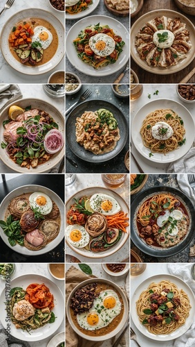 A collage of plates showcasing various dishes with eggs and pasta on a light surface top view