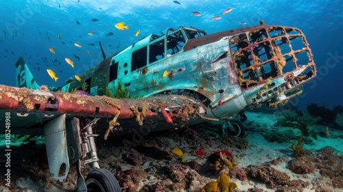 A collapsing airplane hidden among the ocean reefs. The rusty metal frame is covered with colorful corals, algae, and aquatic plants.