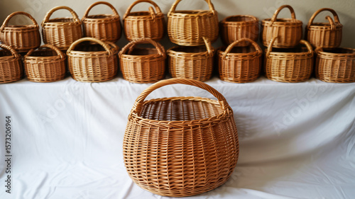 A collection of 15 woven wicker baskets arranged in two rows on a white background.