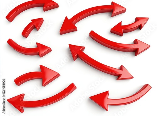 A collection of 3D red curved and pointing arrows on white.