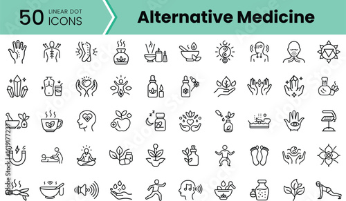 A collection of 50 linear dot icons representing alternative medicine, showcasing various holistic wellness practices and natural remedies.