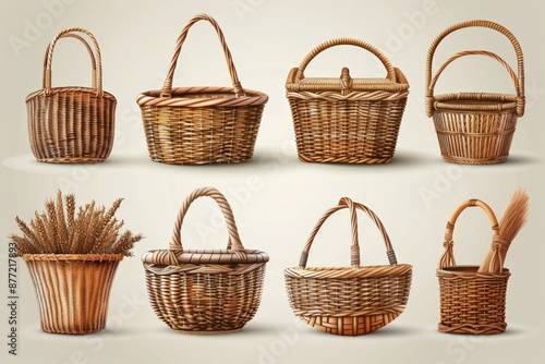 A collection of assorted wicker baskets in various shapes and sizes, showcasing intricate weaving and traditional craftsmanship.