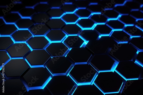 A collection of blue hexagons arranged on a sleek black surface. This image can be used for various design projects and backgrounds