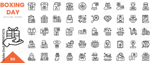 A collection of Boxing Day outline icons featuring gifts, sales, and festive elements.