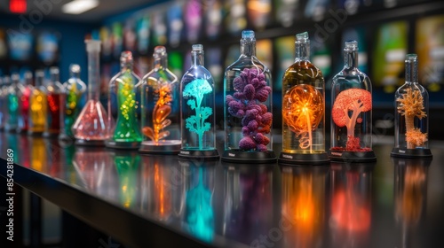 A collection of brightly colored bottles with various shapes and designs displayed on a reflective surface.