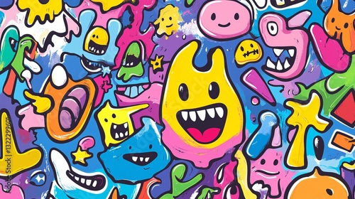 A collection of crayon-drawn doodle shapes and figures, designed for childish collages. These hand-drawn, naive, and abstract shapes include quirky, bizarre forms that are full of playful energy.