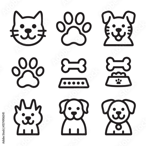 A collection of cute pet icons featuring dogs, cats, paw prints, and dog bones with food bowls