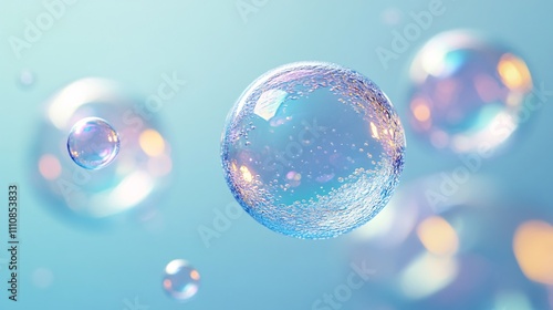 A collection of delicate, iridescent bubbles floating in a soft blue background, creating a serene and whimsical atmosphere.