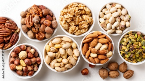 A collection of different nuts displayed in white bowls on a plain white background. The assortment includes almonds, pistachios, walnuts, and hazelnuts, highlighting healthy eating.
