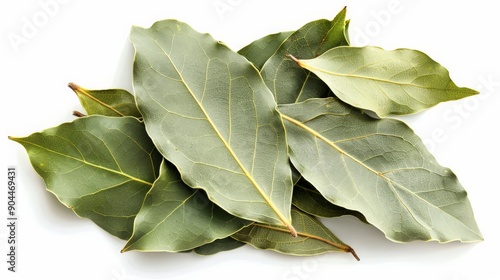 A collection of dried bay leaves, laid out on a white background, showcasing their natural texture and muted green color, often used for culinary purposes.