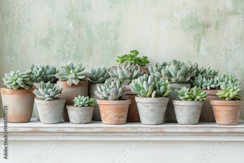 A collection of echeveria succulents in terracotta pots arranged on a rustic shelf.
