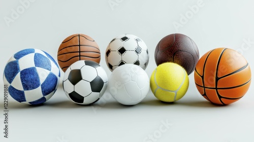 A collection of eight different soccer and basketballs presented against a light background, highlighting differences in color and pattern, AI generated