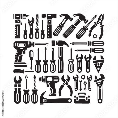 A collection of essential hand tool icons including hammers screwdrivers and wrenches Logo silhouette on white background