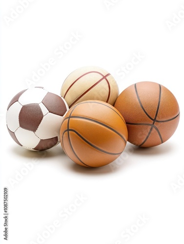 A collection of four sports balls, including a soccer ball and basketballs, on a white background.