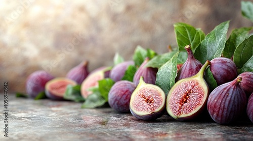 A collection of fresh figs and fig leaves gracefully placed on a rustic surface, representing nature's bounty and abundance with their rich colors and natural texture.