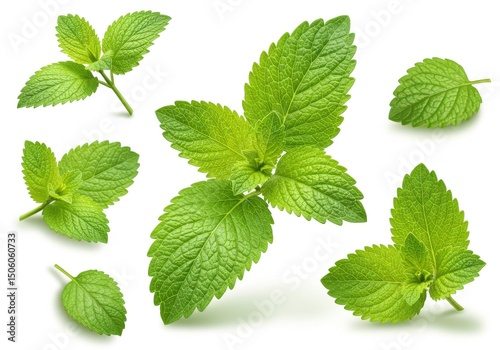 A collection of fresh green mint leaves arranged on a white surface in a studio setting showing details