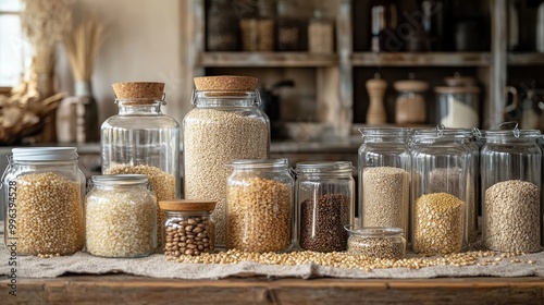 A collection of glass jars filled with various grains of different sizes displayed on a table with a kitchen backdrop